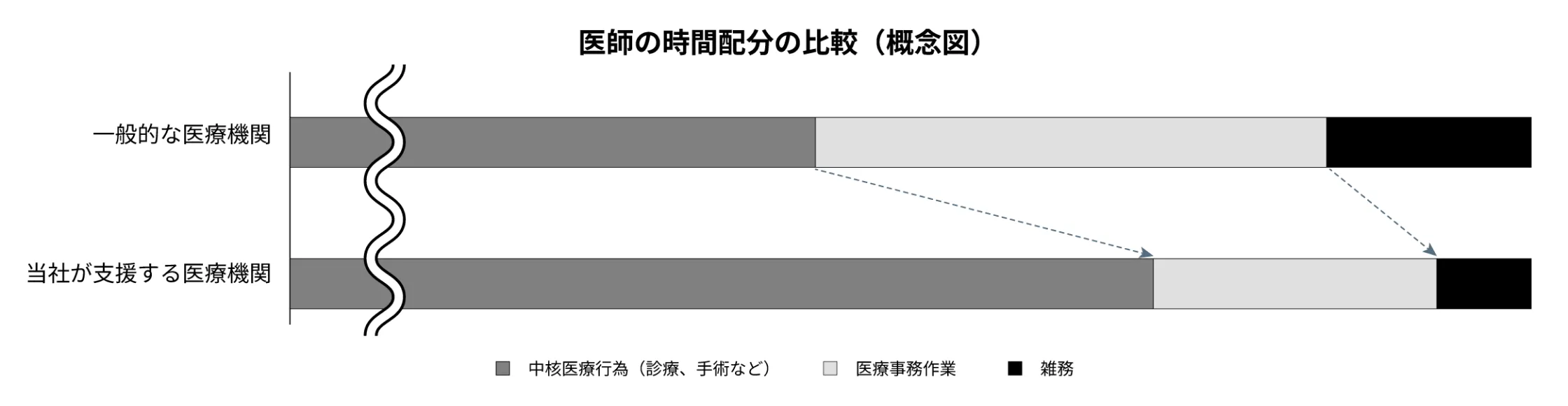- 本図は、厚生労働省「医師の働き方改革(タスク・シフト/シェア)」関連資料を基に、一般病院とオペ専門医療機関における業務配分の考え方を概念的に示したものです。実際の時間配分や運用は、施設・診療科・体制により異なります。