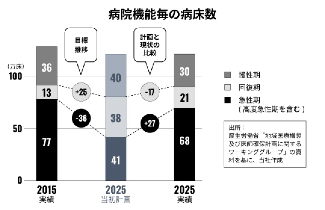 地域医療構想では2025年に向けて病床機能の最適化が掲げられてきましたが、実際には急性期病床が過剰となり、回復期との役割分担が十分に進んでいない現状があります。真に急性期医療を担う医療機関の集約が進まないことが、医療提供体制全体の非効率性を生んでいます。